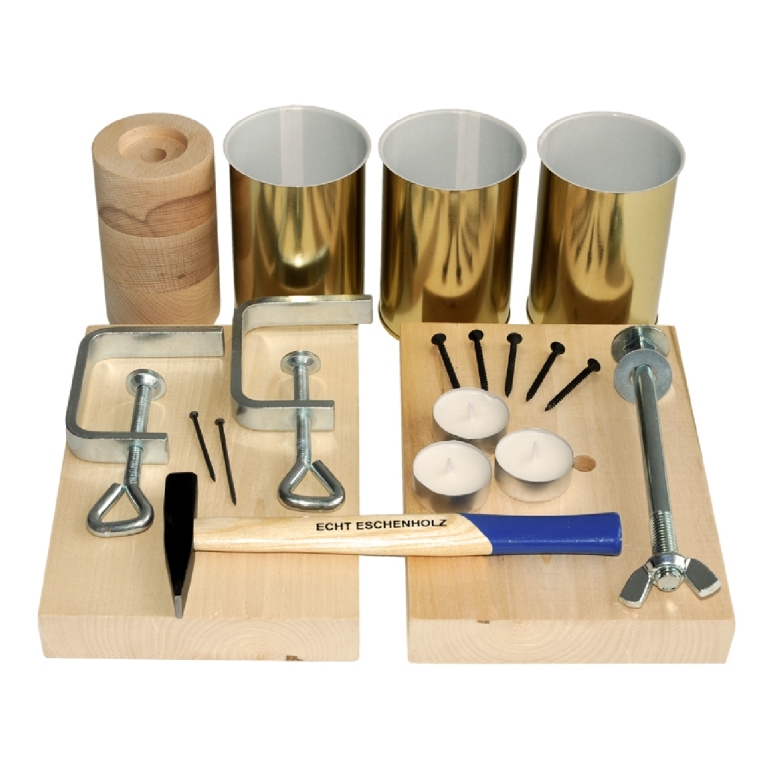 A készletben benne van 2 db fém szorítóval stabilan asztalhoz szerelhető, összeszerelhető fa henger a konzervdobozok rögzítéséhez, 1 db kalapács, 3 db konzervdoboz, szögek, csavarok a lyukasztáshoz, mintasablonok a díszítéshez, 3 db mécsesbetét. Minden adott egy hangulatos esti kivilágításhoz.