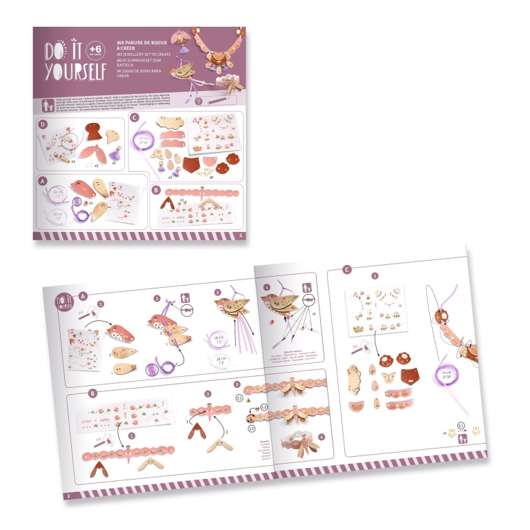 Kreatív készlet elegáns, szintetikus bőrből ékszerkészlet készítéséhez, amely nyakláncot, karkötőt, brossot és egy hajbavalót tartalmaz. A javasolt sablonok szerint helyezze a bőrdarabokra a matricákat, ceruza segítségével dörzsölje át. Matricázás után rakja össze az egyes darabokat, díszítse a készletben levő szalagokkal, gyöngyökkel, bojtokkal. Az eredmény egy egyedi ékszerkészlet lesz.