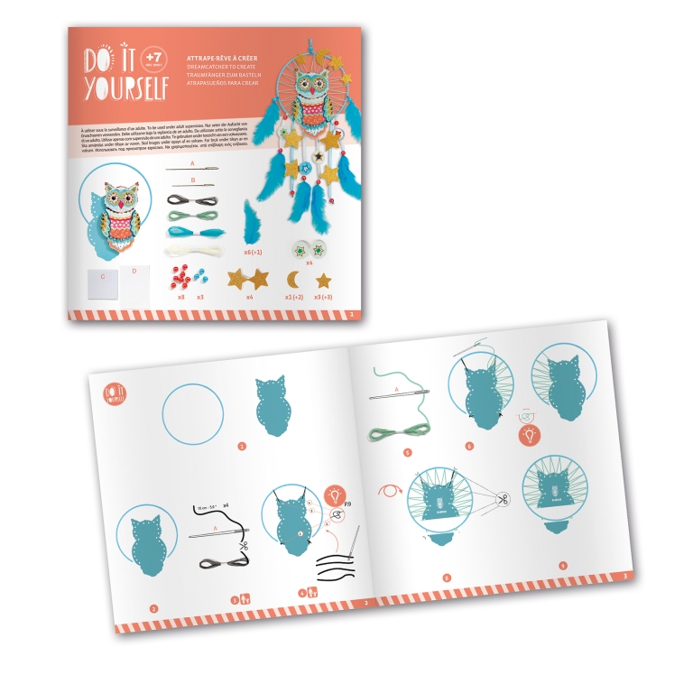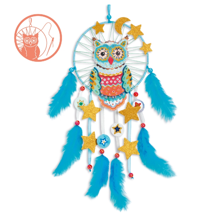 Teljes kreatív készlet egy költői álomfogó készítéséhez a fülesbagoly képének színes fonalakkal, gyöngyökkel, szalagokkal és tollakkal való díszítésével. Gyönyörű dekorációs tárgy, amelyet felakaszthatsz a szobádba, hogy távol tartsd a rossz álmokat. Egy takaros dekoratív termék fémes csillogással. A készletben található útmutatóban lévő utasítások lépésről lépésre követhetően végigvezetik a gyermeket az alkotás minden szakaszán.