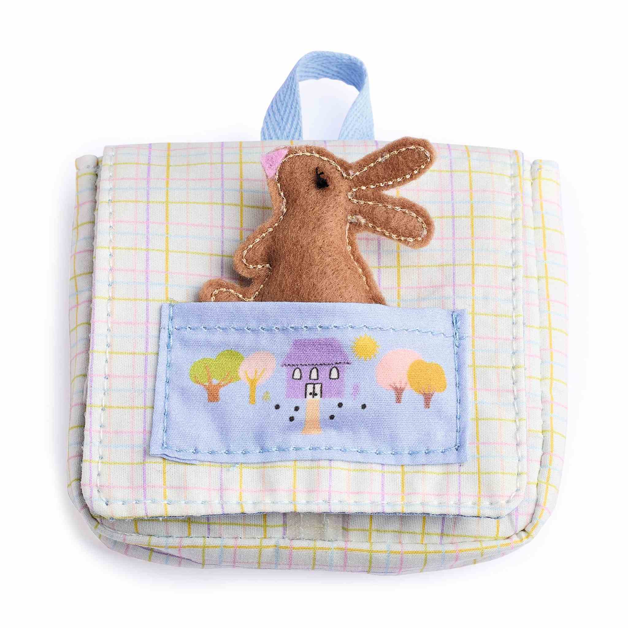 Imádnivaló iskolatáska LOVELY babáknak. Tökéletes méret a baba apróságainak tárolásához, de ami a legcukibb, nagy zsebében egy aranyos bújós nyuszi rejtőzik.