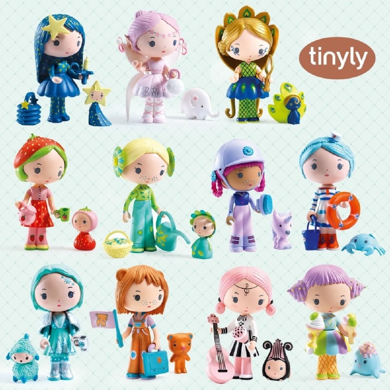 Mindennapok hercegei, hercegnői gyűjthető játékfigurái a Tinyly figurák. Flóra az kertészlány, kosárral, kannával, és örök kísérőjével, Virággal.