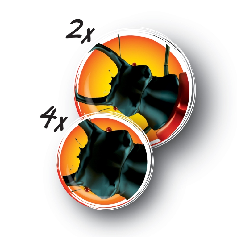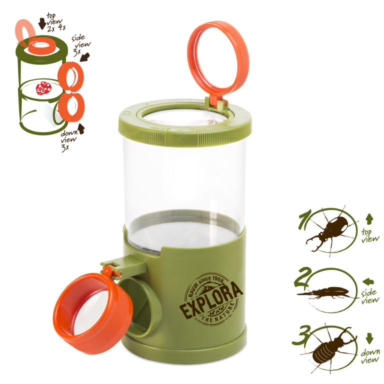 Hármas bogárvizsgáló pohár csipesszel. 3 nézetből: felülről, oldalról és alulról is megfigyelhetők a bogarak. A tükör törhetetlen anyagból készült.
