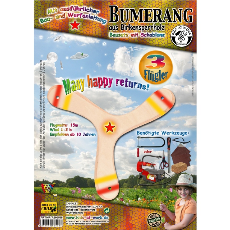 Több fajtája és formája ismert, ebben az esetben egy 3 szárnyú, visszatérő bumerángot készíthetsz magadnak. Ha ügyesen készíted el, és jól használod, akkor miután eldobod vissza fog repülni hozzád. Ebben a csomagban egy rétegelt nyírfa lapot találsz amiből a csomagolásban lévő sablon segítségével kivághatod a buneráng formát. Reszelő segítségével a szárnyak bizonyos részeit a megfelelő módon szükséges lekerekíteni, úgy nevezett "szárny profilt" kialakítani. Az elkészítéshez szükséged lesz lombfűrészre, reszelőre, csiszolópapírra.