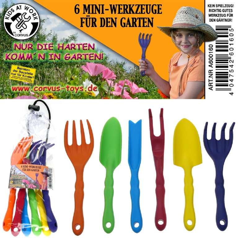 A kertben előforduló palántázás, növénygondozás, ültetés során használható, praktikus műanyag szerszámok. Cserepes növények gondozásához használható. 3 éves kortól kitűnő homokozó eszköz is lehet.