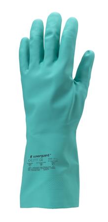 Védőkesztyű mikroorganizmusok elleni védelemel. -anyaga: zöld akrilonitril-pamutbolyhozott belső-sav-, lúg-, olaj-, zsír-, és vegyszerálló-csúszás ellen érdesített tenyér-0,38 mm vastag-hosszúság: 32 cm-CE minősítés-méret: 9/L
